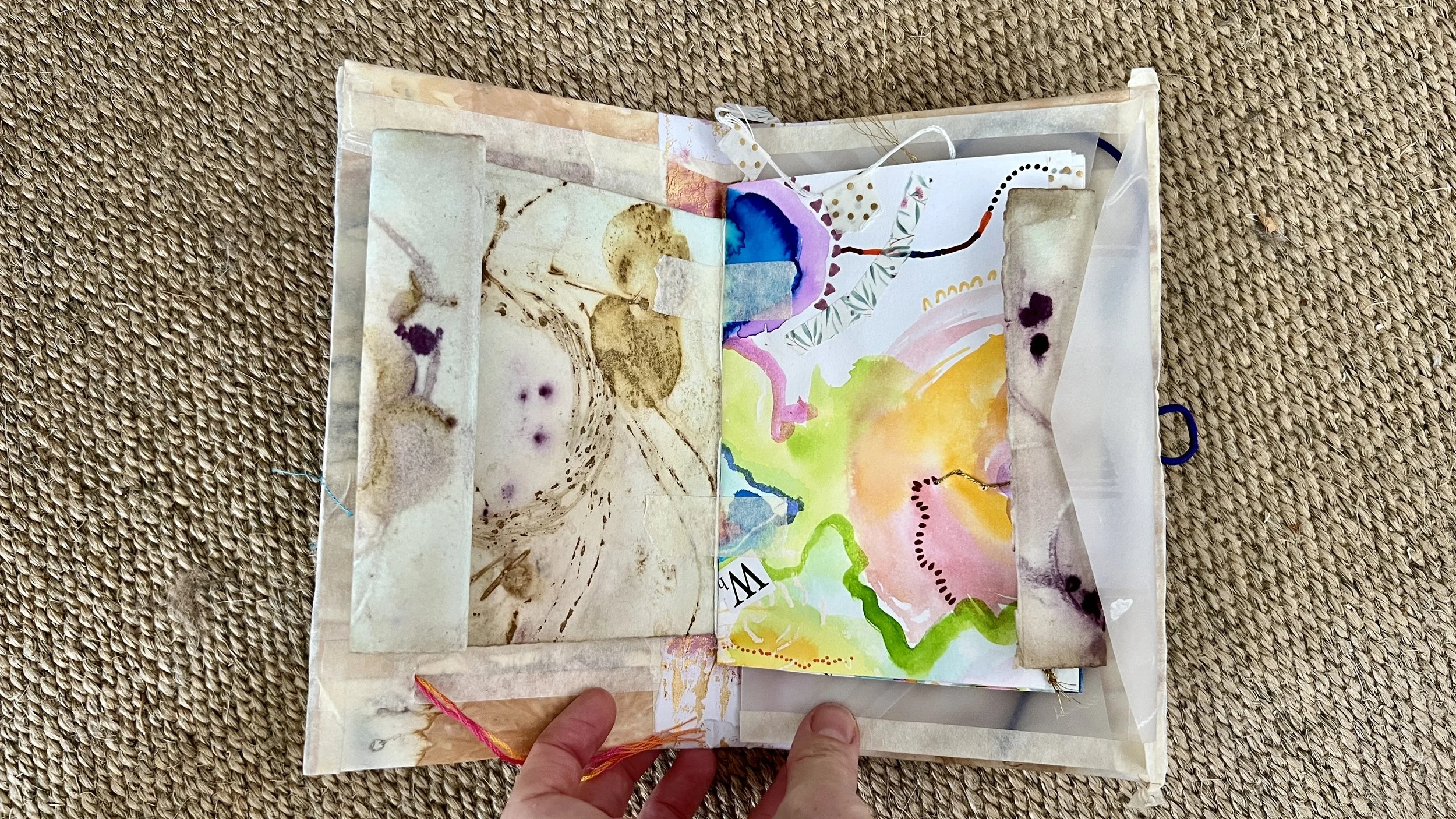 Single page notebook. Using acrylic paint sticks, market and collage. By Chrissy Foreman